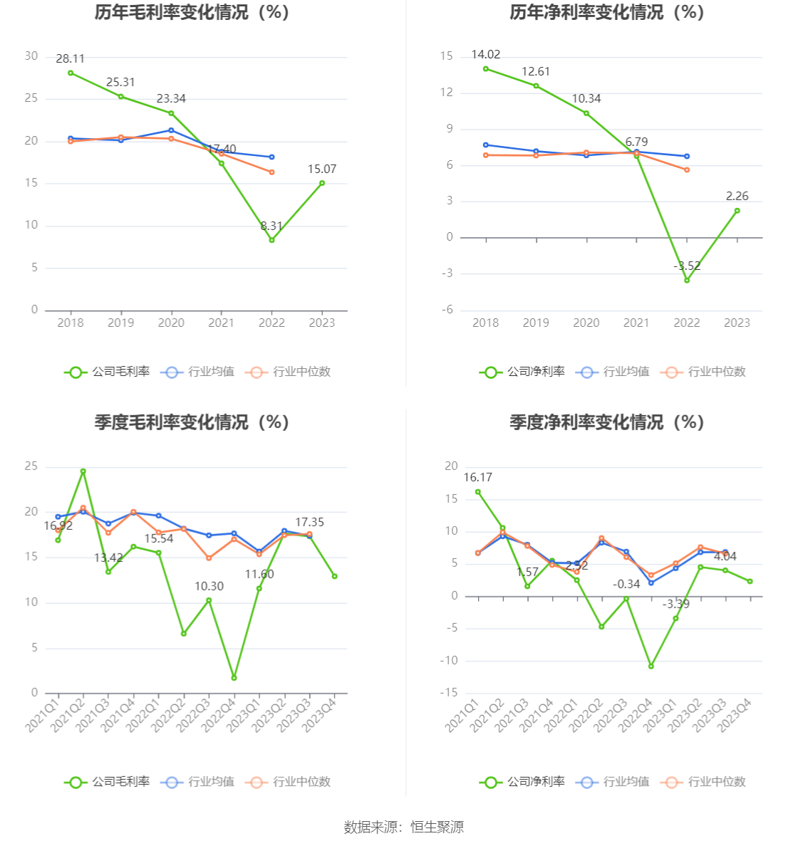 2023年,公司毛利率为15.07%,同比上升6.76个百分点;净利率为2.26%,较上年同期上升5.78个百分点。从单季度指标来看,2023年第四季度公司毛利率为12.94%,同比上升11.22个百分点,环比下降4.41个百分点;净利率为2.34%,较上年同期上升13.14个百分点,较上一季度下降1.70个百分点。