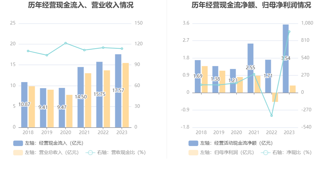 2023年,公司营业收入现金比为113.58%,净现比为952.05%。