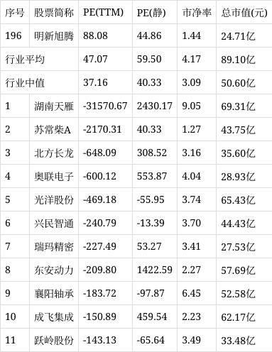 从行业市盈率排名来看,公司所处的汽车零部件行业市盈率平均47.07倍,行业中值37.16倍,明新旭腾排名第196位。