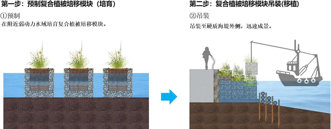 近年来,正和生态的生态工法实践从河湖逐渐走向海洋。莆田蓝色海湾项目通过拟自然的生态工法还原自然生境,增强蓝碳功能,因地制宜应用湿地修复、退养还滩、海堤生态化改造、内湾纳潮、防风林修复等多种措施,营造了可持续的滨海水陆交界带。广州南沙灵山岛尖外江生态修复结合区域水文、气象等特点,利用土工格式、枝桠沉床等多种组合式生态工法对感潮河段滨海岸线进行生态修复。东莞滨海湾新区硬质海堤生态化改造项目,采用基于NbS理念的生态工法模块培移技术,可解决强动力海岸植被成活率低、外海施工成本高的问题,为硬质海堤生态化改造提供了创新的解决方案。