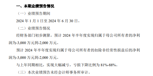 经财务部门初步测算,预计 2024 年半年度实现归属于母公司所有者的净利润为-3,000 万元到-2,000 万元,预计 2024 年半年度实现归属于母公司所有者的扣除非经常性损益后的净利润为-3,000 万元到-2,000 万元,与上年同期相比,实现大幅减亏,亏损下降比例为 81%-88%。