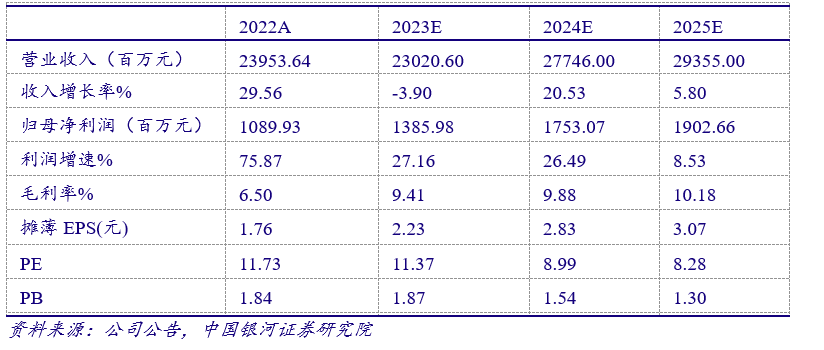 预计公司2023-2025年归母净利润分别为13.86亿元、17.53亿元、19.03亿元,对应PE分别为11.4倍、9倍、8.3倍,维持“推荐”评级。