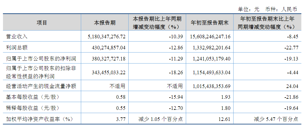 2025年第三季度,九丰能源实现营业收入51.80亿元,同比下降10.39%;实现归属于上市公司股东的净利润3.80亿元,同比下降11.29%。