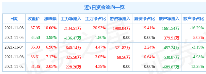 资金流向数据方面,当日主力资金净流入2134.51万元,游资资金净流入1980.04万元,散户资金净流出1661.54万元。近5日资金流向一览见下表: