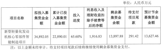 此次拟终止的项目为“新型轻量化发动机核心零部件智能制造项目”(以下简称“新型轻量化项目”),该项目原计划作为公司产能扩张的核心抓手,总投资规模曾高达7.5亿元,其中计划使用募集资金3.49亿元。