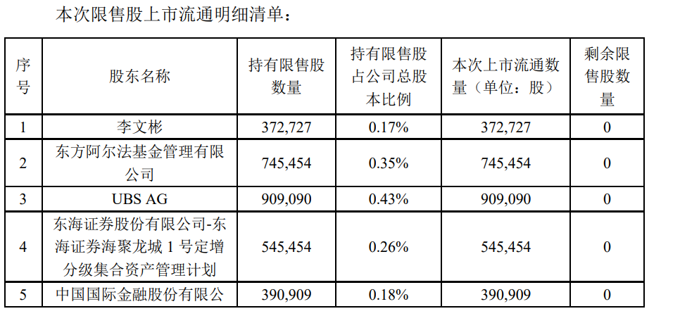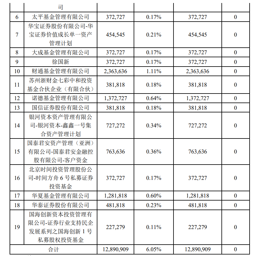 此次解禁的股东有19名,即上述19名特定发行对象。这些发行对象中,除了李文彬、徐国新分别为C4类普通投资者、C5类普通投资者外,其于17名均为A类专业投资者,包括券商、私募、公募等。