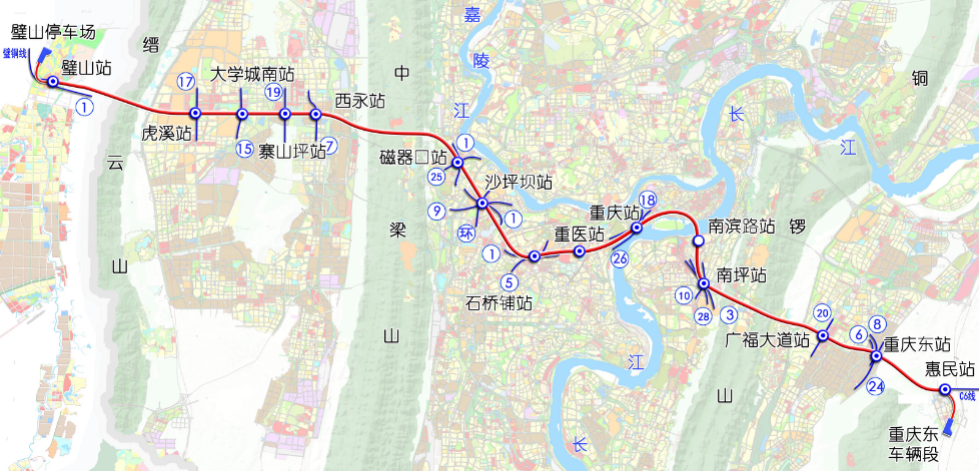 重庆轨道交通27号线是中心城区重要的城轨快线,西起壁山站,东至惠民站,线路全长56.01公里,设计时速140公里/小时,全线设车站15座。线路横跨主城都市区东西向三大槽谷,串联沙坪坝站、菜园坝站(重庆站)、重庆东站三大铁路客运枢纽及沙坪坝、大坪、南坪三大商圈。作为市域快线网络的关键组成部分,该线路两端还将与壁铜线、南川线贯通运营,实现外围区域与主城区的直达联通。