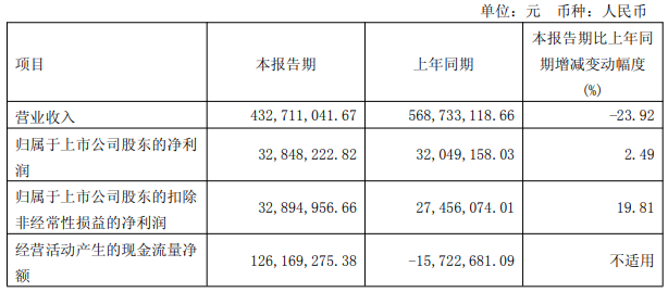 2025年第一季度,上海沿浦实现营业收入4.33亿元,同比下降23.92%;归属于上市公司股东的净利润0.33亿元,同比增长2.49%;归属于上市公司股东的扣除非经常性损益的净利润0.33亿元,同比增长19.81%;经营活动产生的现金流量净额1.26亿元,上年同期为-0.16亿元。