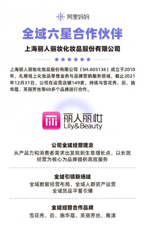 近日,上海丽人丽妆化妆品股份有限公司(605136.SH)凭借优秀的数智经营力,在众多服务商中脱颖而出,荣膺首批荣获阿里妈妈【全域六星合作伙伴】的服务商。