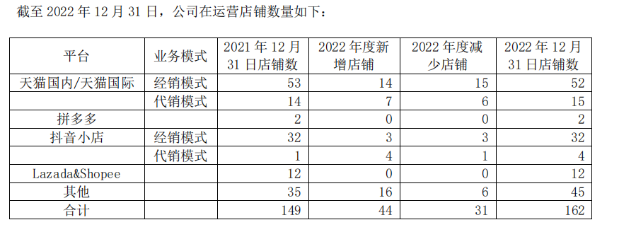 其中,在开拓以抖音为代表的新兴渠道业务方面,营业收入相比上年同期增长超60%;2022年,公司新增乐扣乐扣、城野医生、悦诗风吟等抖音小店,运营的抖音小店达到36家。同时,公司持续开拓京东、唯品会、快手、小红书等境内主流电商购物平台及社交电商平台,合计新增10家店铺。目前,丽人丽妆在运营店铺总数达162家,相比上一年年末增加13家。