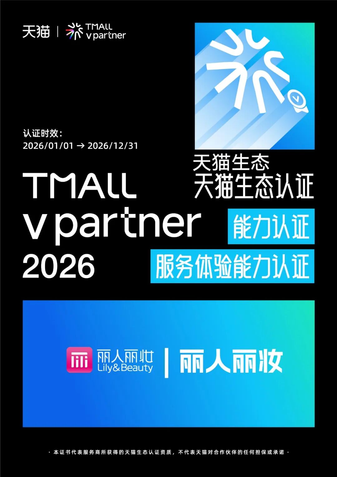 2026天猫生态认证体系以“生态共生、价值跃迁”为核心方向,由星级认证、行业认证及能力认证三大模块构成。其中能力认证分为「数智能力认证」和「服务体验能力认证」,丽人丽妆全部收入囊中。