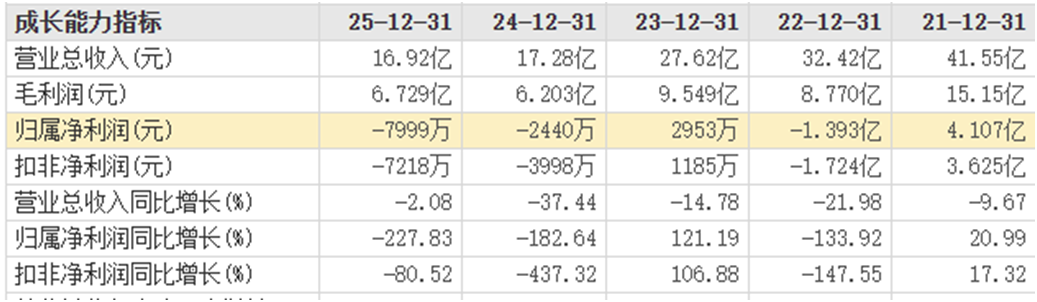 2026年3月27日晚,公司正式披露2025年年度报告,相较于1月21日发布的业绩预告,最终的亏损数据更显触目惊心——全年实现营业收入16.92亿元,同比下降2.08%;归母净亏损定格在7999.12万元,逼近预告上限,扣非后净亏损7217.84万元,较上年同期亏损幅度大幅扩大,公司同时宣布2025年度拟不派发现金红利,不以资本公积转增股本。