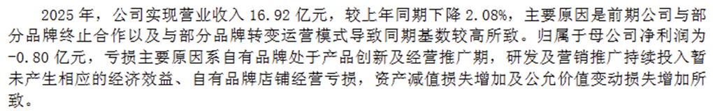 但从业绩表现来看,重金押注的自有品牌不仅未能成为业绩增长点,反而成为拖累公司利润的负担。2025年年报显示,公司净利润亏损进一步扩大,主要原因之一便是自有品牌尚处于产品研发与市场推广阶段,持续投入的研发及营销费用暂未转化为有效收益,相关店铺持续亏损。
