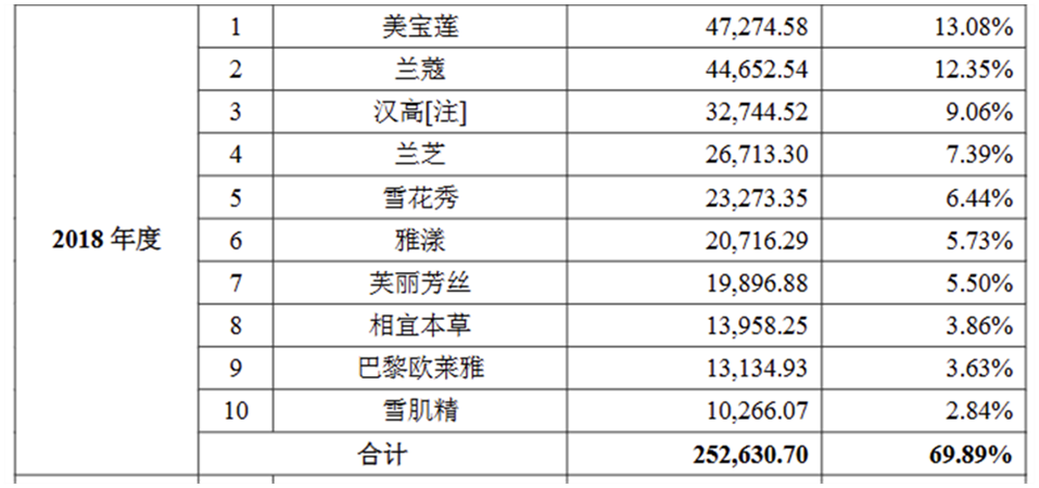 品牌流失成为压垮其营收的重要稻草。多年来,丽人丽妆先后失去欧莱雅、兰蔻、欧碧泉、佰草集、玉泽、雪花秀等多个核心品牌的合作权。据其招股书显示,2018年,仅美宝莲、兰蔻、汉高三大品牌就为其贡献12.47亿元销售收入,占当年营收的34.49%,而这些核心品牌的陆续离场,直接导致公司营收断流。