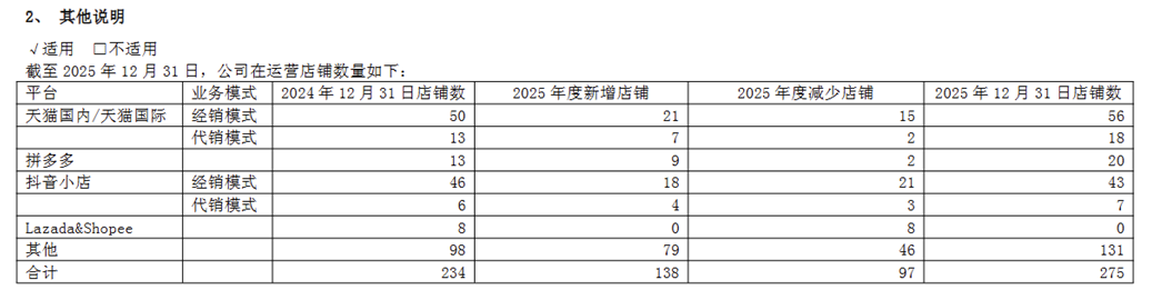 尽管公司试图发力抖音、小红书等新兴渠道,2025年抖音小店数量达到43家(经销模式)和7家(代销模式),但仍难以对冲传统渠道的下滑压力,未能从根本上改变渠道单一的困境。