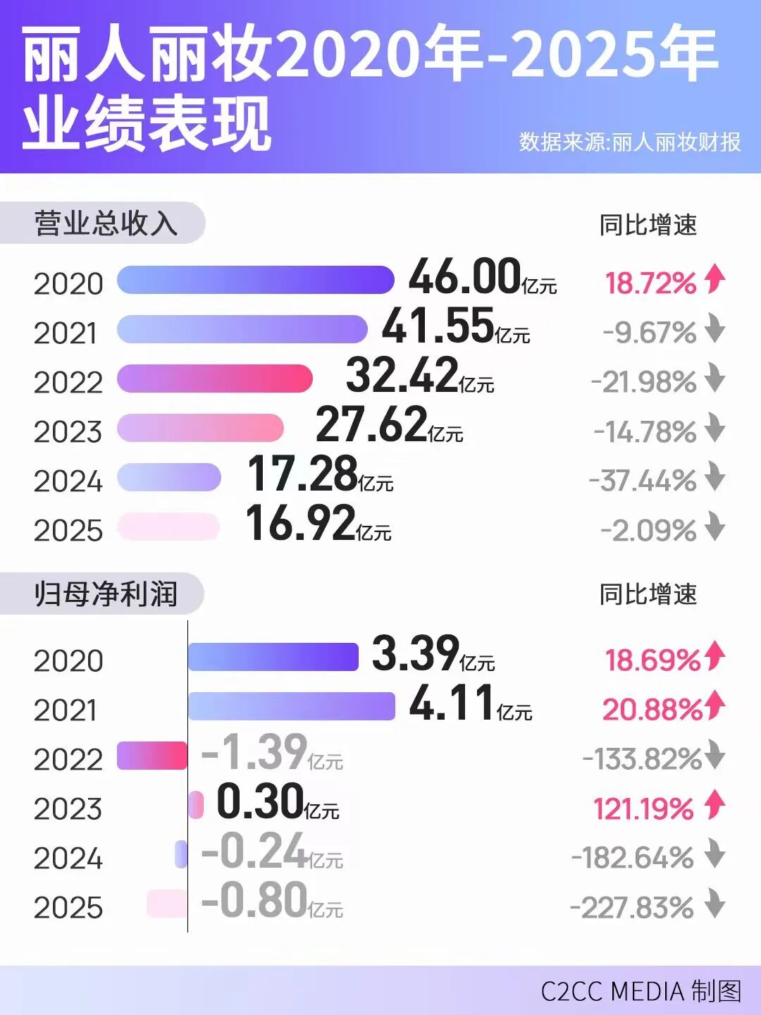 内忧外患之下,丽人丽妆陷入了“进退两难”的境地——继续投入新业务,可能面临更大的亏损;收缩投入,又会彻底失去翻盘的机会。