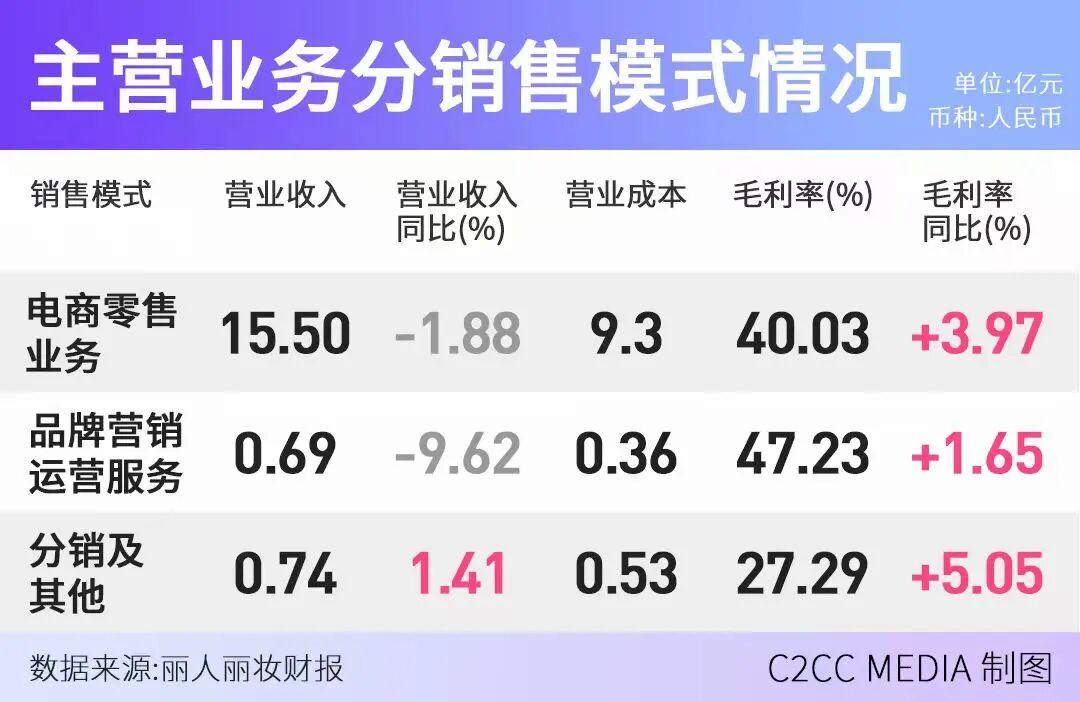 更关键的是,丽人丽妆从“买断销售”的全额计收模式,被迫转为“佣金服务”的部分计收模式,即便品牌销售规模不变,报表上的营收也会出现断崖式缩水,这种“模式降维”,直接导致了营收与毛利的双重坍塌。