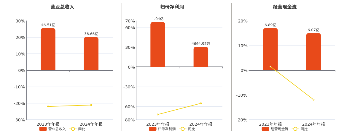 公司营业总收入为36.66亿元,较去年同报告期营业总收入减少9.85亿元,同比较去年同期下降21.18%。归母净利润为4664.95万元,较去年同报告期归母净利润减少5772.46万元,同比较去年同期下降55.31%。经营活动现金净流入为6.07亿元,较去年同报告期经营活动现金净流入减少8224.33万元,同比较去年同期下降11.94%。