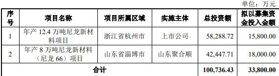 公司于1月18日披露的《向不特定对象发行可转换公司债券募集说明书(上会稿)》显示,本次向不特定对象发行可转换公司债券募集资金总额不超过33,800.00万元(含本数),扣除发行费用后,募集资金用于年产12.4万吨尼龙新材料项目、年产8万吨尼龙新材料(尼龙66)项目。