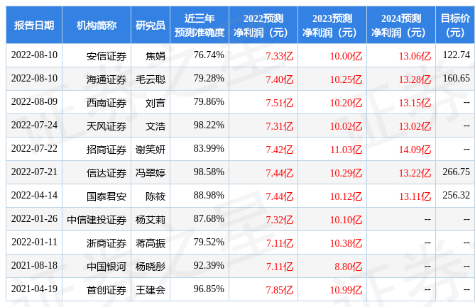 证券之星数据中心根据近三年发布的研报数据计算,信达证券冯翠婷研究员团队对该股研究较为深入,近三年预测准确度均值高达98.58%,其预测2022年度归属净利润为盈利7.44亿,根据现价换算的预测PE为14.71。