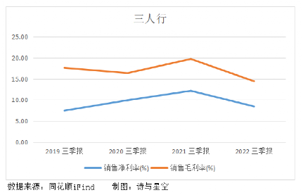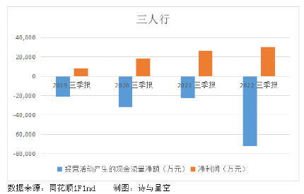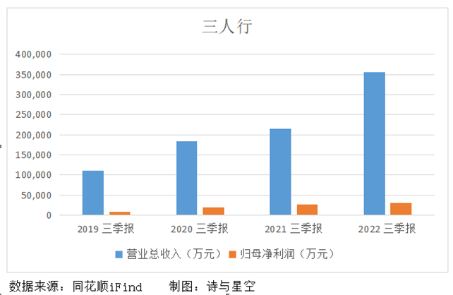 今年前三季度三人行实现营业收入35.68亿,同比增长66.62%;归属于上市公司股东的净利润3.02亿,同比增长15.88%。