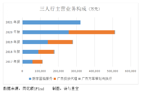 接下这波营销的正是三人行(605168.SH),2020年登录上交所主板。主营业务是数字营销、场景活动服务和校园媒体营销。