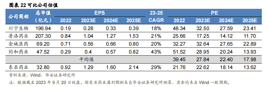3)喹诺酮类抗菌药,上半年公司因和原研厂家合作订单增长,同时叠加需求改善,我们预计喹诺酮类抗菌药有望实现快速增长。我们预计2023-2025年喹诺酮类抗菌药板块收入为1.31亿元、1.53亿元、1.88亿元,同比增长25%、17%、23%;毛利率分别为22%、20%、18%。