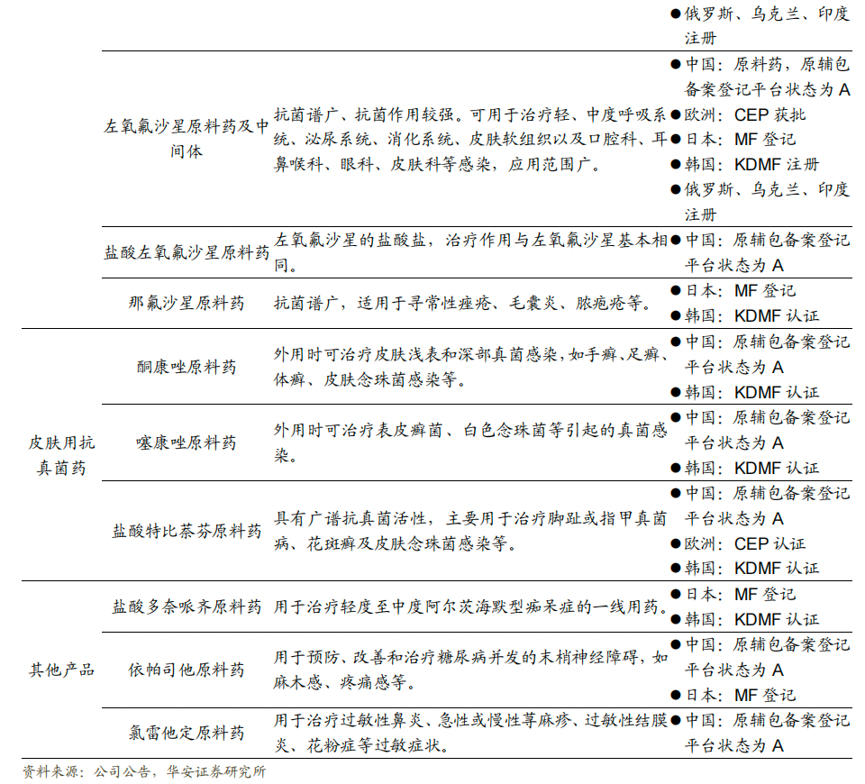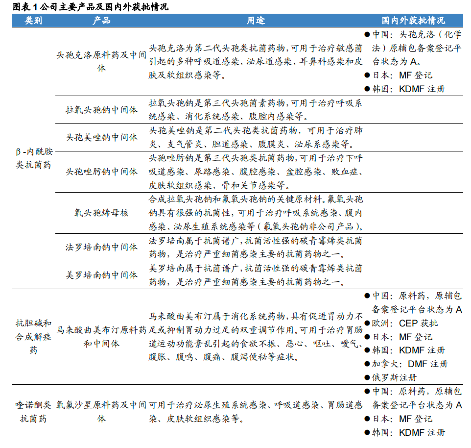 公司是国内β-内酰胺类抗菌药、喹诺酮类抗菌药等领域的代表性企业。产品主要涵盖抗细菌类药、抗胆碱和合成解痉药物、皮肤用抗真菌药物等多个用药领域,并且成功开发出国内领先、环境友好、具有自主知识产权的新工艺,公司是为数不多的可以从起始物料青霉素开始,全产业链合成头孢克洛原料药的公司。