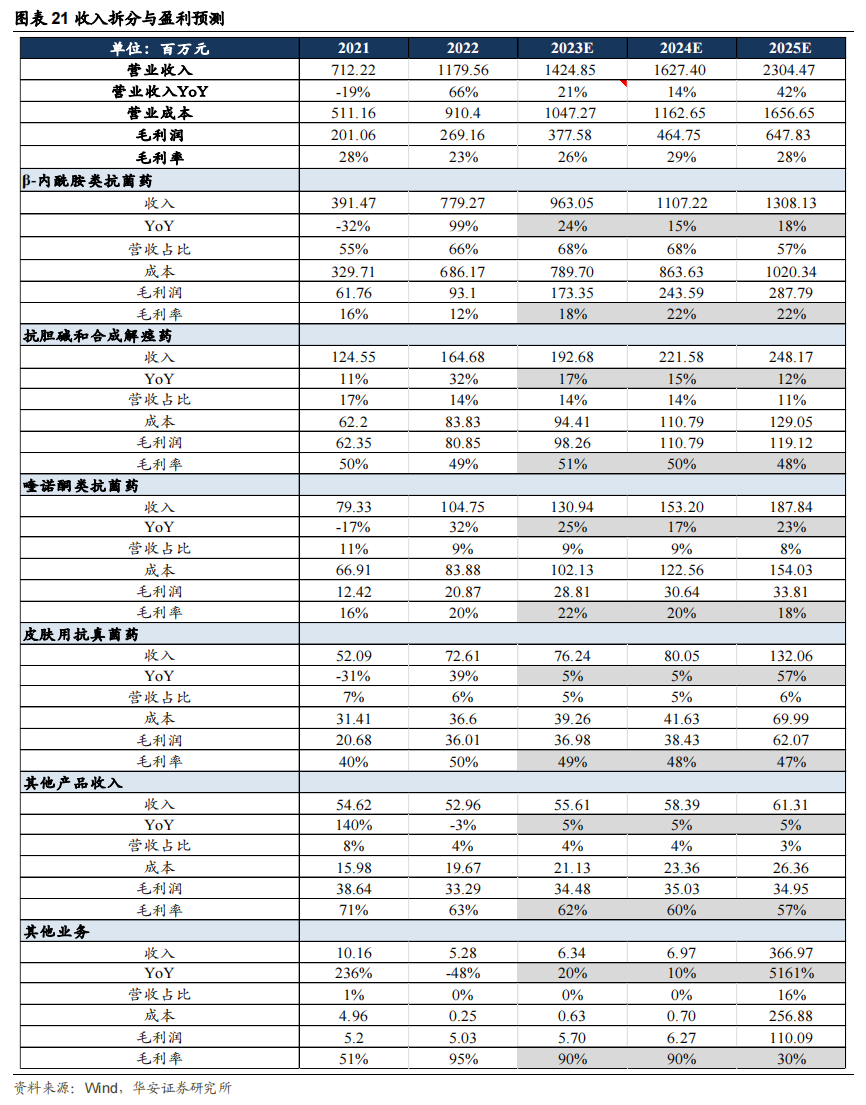 基于1)公司主要品种β-内酰胺类抗菌药下游需求回暖;2)公司进行技改,逐步扩大酶法应用范围;3)IPO及可转债募投项目逐步落地投产及产能爬坡等因素,我们综合预计公司2023-2025年营业收入增速分别为21%、14%、42%。