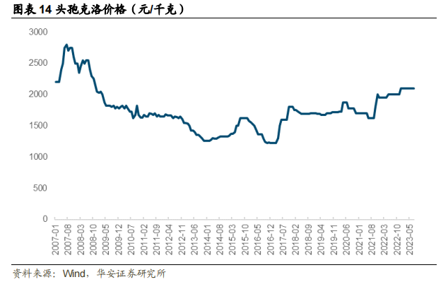 2)报价端:β-内酰胺类抗菌药2023年上半年价格有所上涨,价差持续优化。根据公司公告,由于主要原材料青霉素G钾盐价格的上涨以及市场需求的增长,β-内酰胺类抗菌药2023年上半年价格上涨3%左右。以公司关键品种头孢克洛为例,根据Wind统计,其单价自2023年1月以来持续稳定在高位2100元/千克,也是近十余年的最高价。
