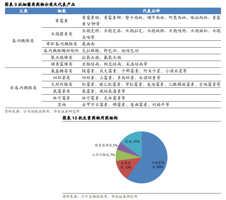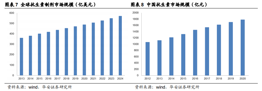 临床治疗对抗生素存在刚性需求,市场规模庞大并持续增长。抗生素是抗干扰药物类别中最主要的组成部分。抗感染药物是基础性用药,在细菌感染以及其他疾病或创伤、手术带来的感染性并发症治疗中均有广泛的应用,为临床用药中最主要的类别之一。抗感染类药物包括抗生素、抗病毒药物、抗真菌药物等,其中抗生素占整个抗感染药物的90%左右。根据川宁生物招股书,从终端市场来看,预计2023年全球抗生素制剂的市场规模超500亿美元,并持续增长。国内抗生素行业虽受限抗等管理措施影响增速有所下滑,但市场规模仍在持续增长,2020年市场规模达到1780亿元。预计未来行业整体仍将维持较大需求。