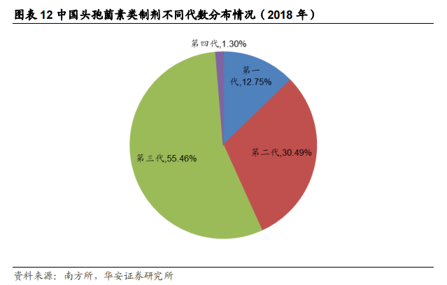 二、三代头孢菌素类药物占比最高,临床使用最为广泛。根据南方所,2018年我国第二、第三代头孢菌素类药物使用量占头孢菌素类药物整体市场份额分别为30.49%、55.46%,是目前临床用药选取的最主要的头孢菌素类药物。