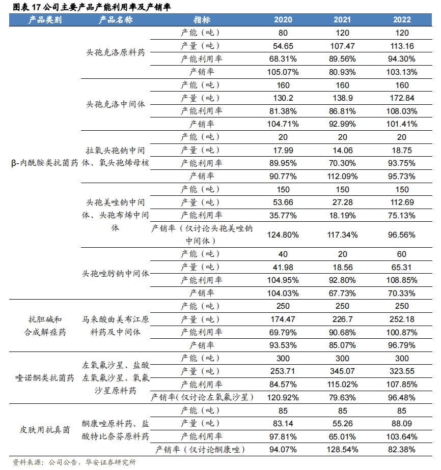 公司产能利用率维持高位,新产能建设将推动公司进一步发展。我们列举公司的主要产品,可以发现头孢克洛原材料及中间体等产能利用率及产销率均处高位,下游产品需求旺盛。