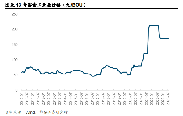 1)成本端:青霉素工业盐价格在过去两年持续攀升后开始下行。青霉素工业盐又称青霉素G钾,上游原料主要为玉米,下游最主要用于生产青霉素类抗生素和部分头孢类抗生素,可用于生产6-APA、7-ADCA等中间体或直接生产青霉素钾、青霉素钠及克拉维酸钾等。根据Wind数据,截至2023年7月,国内青霉素工业盐报价为170元/BOU,相较于2021年1月的80元/BOU上涨112.50%,相较于高位212.5元/BOU已开始下行。我们认为,青霉素工业盐未来仍有降价空间,利润端有望持续改善。