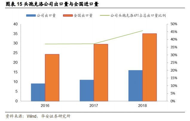 公司积极布局海外市场,叠加新产能释放将进一步推动头孢克洛原料药放量。公司头孢克洛原料药不仅取得了国内药品批件,同时已取得日本、韩国、土耳其、巴基斯坦等海外市场药品批件,产品出口量位居国内前列,2018年公司头孢克洛原料药出口占我国头孢克洛原料药出口份额已超过40%,在出口市场具有显著地位。