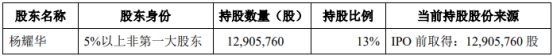 截至公告披露日,杨耀华持有公司股份12,905,760股,占公司总股本的13%。上述股份为公司首次公开发行股票前持有及2020年度权益分派送红股取得的股份,已于2022年2月23日起上市流通。
