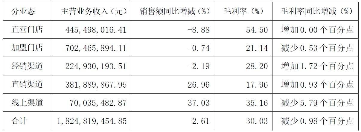 根据公司披露的三季度主要经营数据显示,截至2024年9月30日,来自直营门店的销售收入同比减少了8.8%;来自加盟门店的销售额同比降低了0.74%。