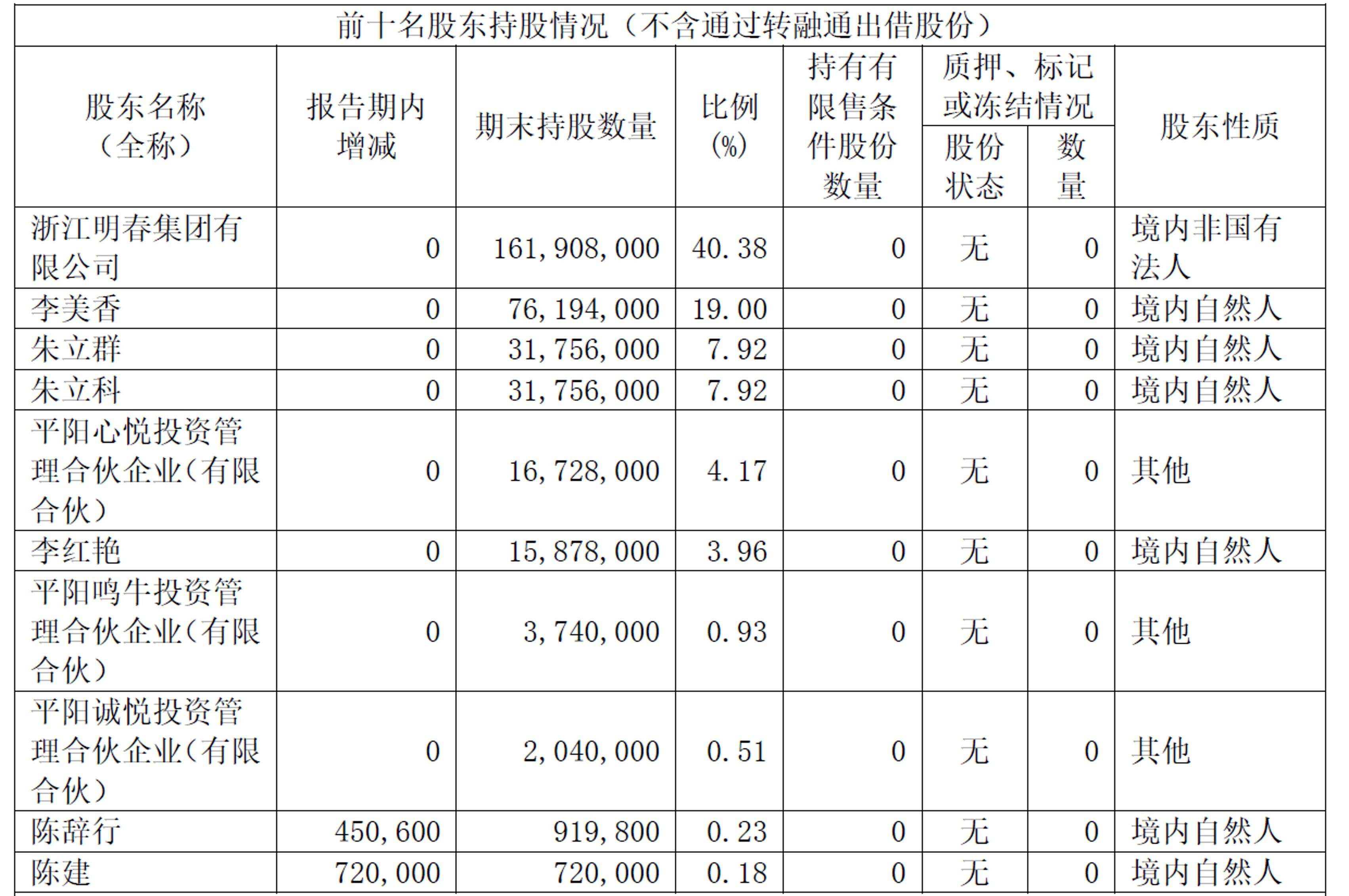 从股权架构来看,一鸣食品是典型的温州“父子档”家族企业。根据2024年半年度报告披露,公司前十大股东中李美香、朱立科、朱立群、李红艳均为家族成员,而根据爱企查,最大股东浙江明春集团有限公司法人代表为朱明春,持有70%股份,其余股东成员分别为朱立科、朱立群和李美香。这样来看五名家族成员合计拥有一鸣食品总计79%的股份。