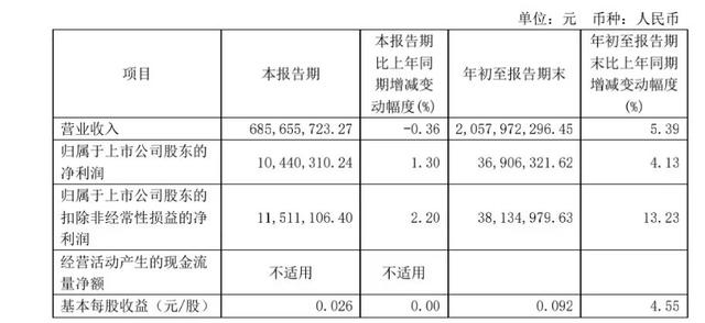 单季度来看,第三季度,一鸣食品实现营业收入约为6.9亿元,同比下降约为0.36%;归属于上市公司股东的净利润约为1044万元,同比增长约为1.3%。