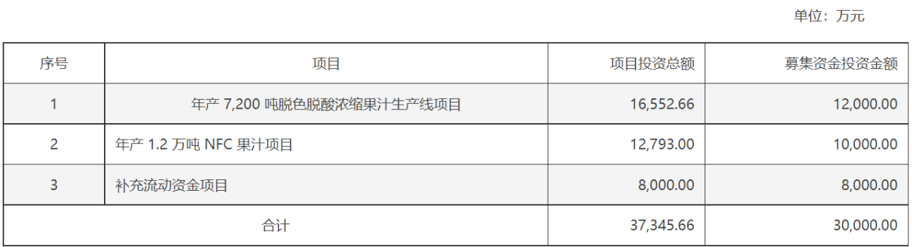 5月10日,安德利(605198.SH)发布了2024年度以简易程序向特定对象发行A股股票预案。该公司计划通过向不超过35名(含35名)的特定投资者发行股票募集资金3亿元,其中,1.2亿元用于年产7200吨脱色脱酸浓缩果汁生产线项目,1亿元用于年产1.2万吨NFC果汁项目,0.8亿元用于补充流动资金。