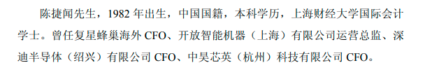 资料显示,陈捷闻,上海财经大学国际会计学士。曾任复星蜂巢海外CFO、开放智能机器(上海)有限公司运营总监、深迪半导体(绍兴)有限公司CFO、中昊芯英(杭州)科技有限公司CFO。