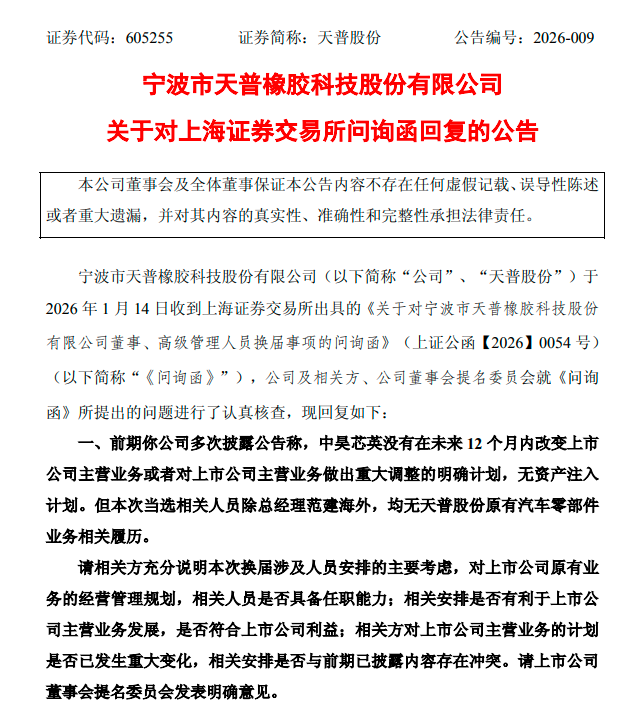 从内容来看,上交所一连追问数条,直指天普股份此前“无改变主营业务计划”、“与股东中昊芯英自身现有资本证券化路径无关”的承诺,与此次管理层“大换血”之间存在明显反差,质疑其是否“言行相悖”。