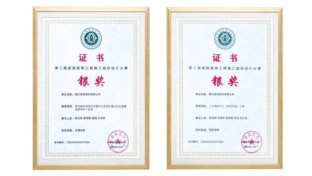 1月7日至8日,中国建筑装饰协会公共建筑装饰工程分会2025年年会在海南顺利举行。德才股份董事长叶德才作为分会轮值会长出席会议,宣读了协会议案,并为新增副会长单位颁发证书。会上同期公布第二届建筑装饰工程施工组织设计大赛获奖名单,德才股份承建的“上合商务中心(室内改造)工程”与“青岛新机场综合交通中心及停车楼公共区域精装修项目一标段”双双荣获银奖,体现公司在复杂项目中的综合技术与管理能力。