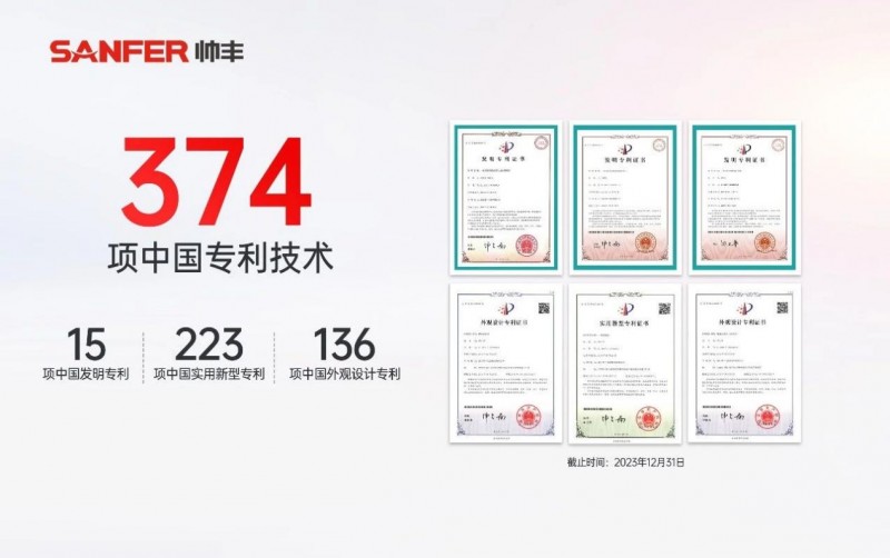 截止目前,帅丰拥有374项专利技术,在集成灶烟机风道系统、燃烧器系统、蒸烤箱系统等几大核心系统的技术性能上,都拥有自主知识产权,且每一项系统的性能指标都领先于行业;