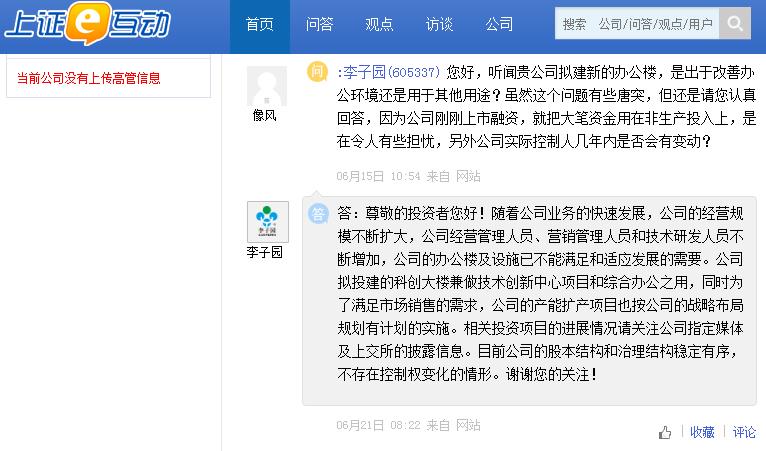 此外,在上证e互动,有投资者提出质疑,公司拟建新的办公楼,是出于改善办公环境还是用于其他用途?该投资者称:“公司刚刚上市融资,就把大笔资金用在非生产投入上,实在令人有些担忧。”另外该投资者还询问,公司实际控制人几年内是否会有变动?