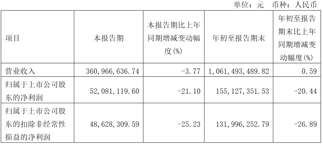 三季度报综述:2022年前三季度实现营业收入10.61亿元,同比增长0.59%;实现归母净利润1.55亿元,同比下降20.44%。其中,第三季度实现营业收入3.61亿元,同比下降3.77%;实现归母净利润0.52亿元,同比下降21.10%。