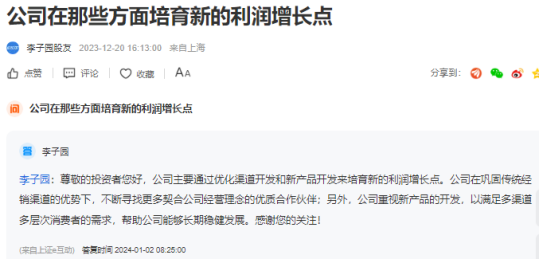 李子园表示,公司主要通过优化渠道开发和新产品开发来培育新的利润增长点。公司在巩固传统经销渠道的优势下,不断寻找更多契合公司经营理念的优质合作伙伴;另外,公司重视新产品的开发,以满足多渠道多层次消费者的需求,帮助公司能够长期稳健发展。