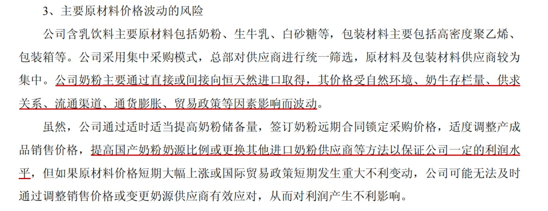 2024年财报中,李子园透露了一个十分重要的信息:公司含乳饮料的原材料主要通过直接或间接向恒天然进口取得。由于奶粉价格受自然环境、奶牛存栏量、供求关系、贸易政策等因素影响而波动,公司还面临着控制成本的挑战。