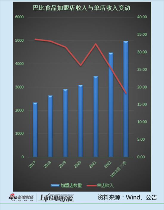 从2022年起,巴比食品加快了异地扩张步伐,加盟门店数量大幅增长,令人担忧的是,单店收入在快速下滑,2023年前三季依然没有明显改善。