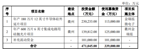 立昂微2022年11月10日发布公开发行可转换公司债券募集说明书,公司本次发行可转换公司债券的募集资金总额(含发行费用)为339,000万元,扣除发行费用后,募集资金拟投资于年产180万片12英寸半导体硅外延片项目、年产600万片6英寸集成电路用硅抛光片项目、补充流动资金。